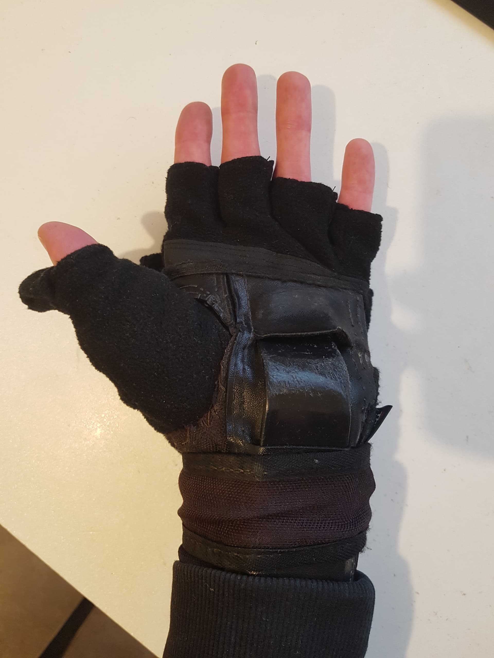 Porté et « clapet » rabattu sur le dessus de la main (notez le luxe du pouce déshabillable…) :