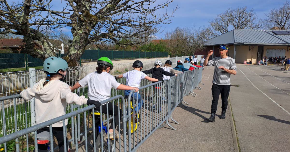 3ème année pour l’initiation au monocycle le temps d’une récré rallongé pour les Cm de mon village. Ils surkiff et se débrouillent carrement bien au bout de 4 séances. L’équipe pedagogique de l’école et la mairie adhèrent à fond au projet (prêt des barrieres, installation de crochets pour ranger les monos … ) Et une fois le cycle monocycle terminé les jeunes peuvent continuer en autonomie (si ils ont leur casque) Résultat ça joue autant au foot, à la corde à sauter … qu’au mono à la récré.