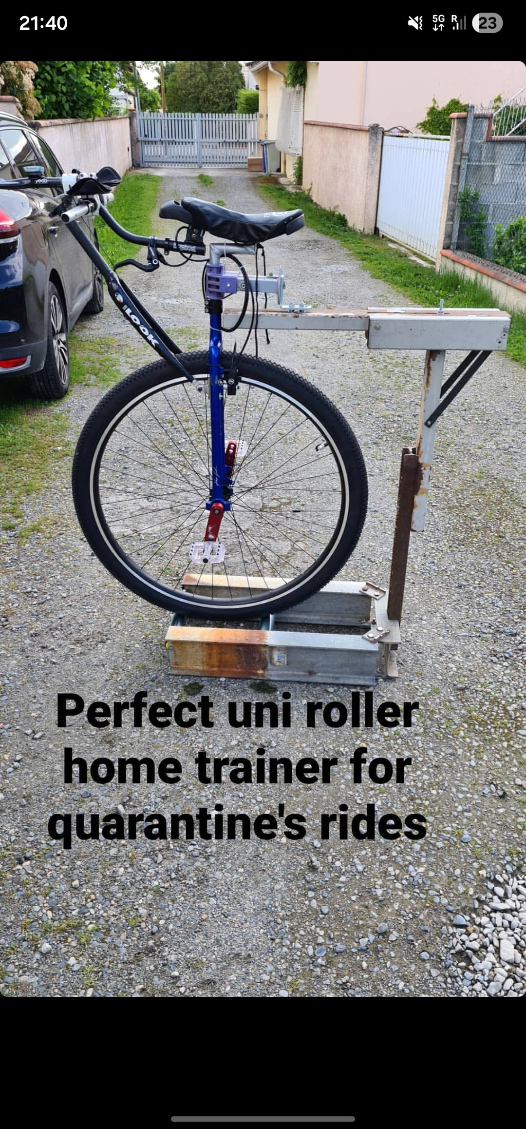 J ai des monocycles à la maison, un home trainer à rouleau.