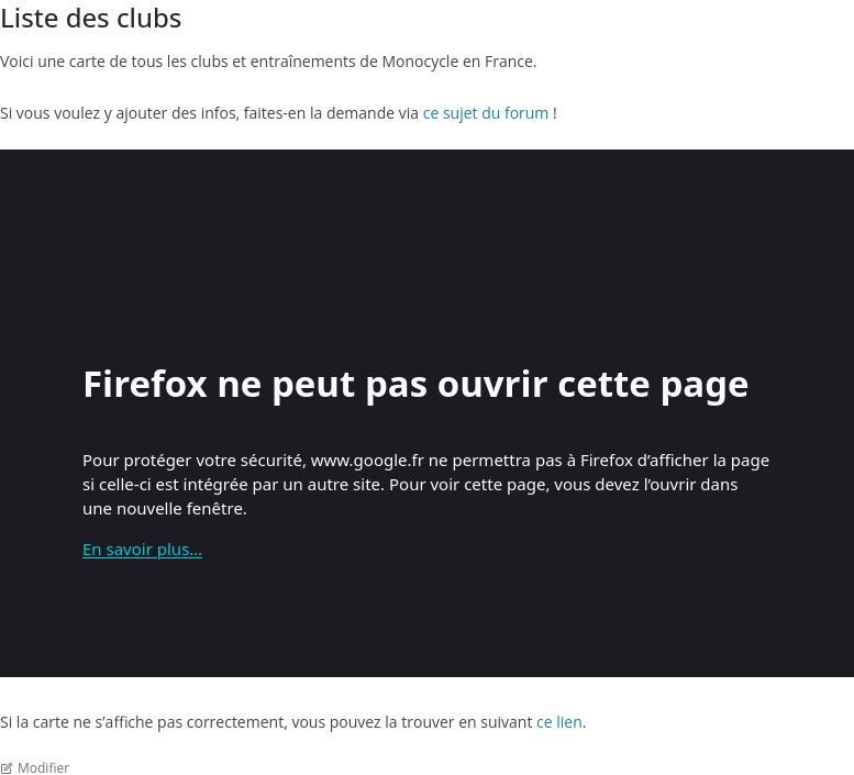 Par ailleurs, il m’a été indiqué que la carte de la liste des clubs ne chargeait pas correctement. Cependant, j’arrive à l’ouvrir sur deux navigateurs différents. Pourriez-vous essayer de votre côté et m’indiquer si c’est aussi cassé pour vous ? Merci