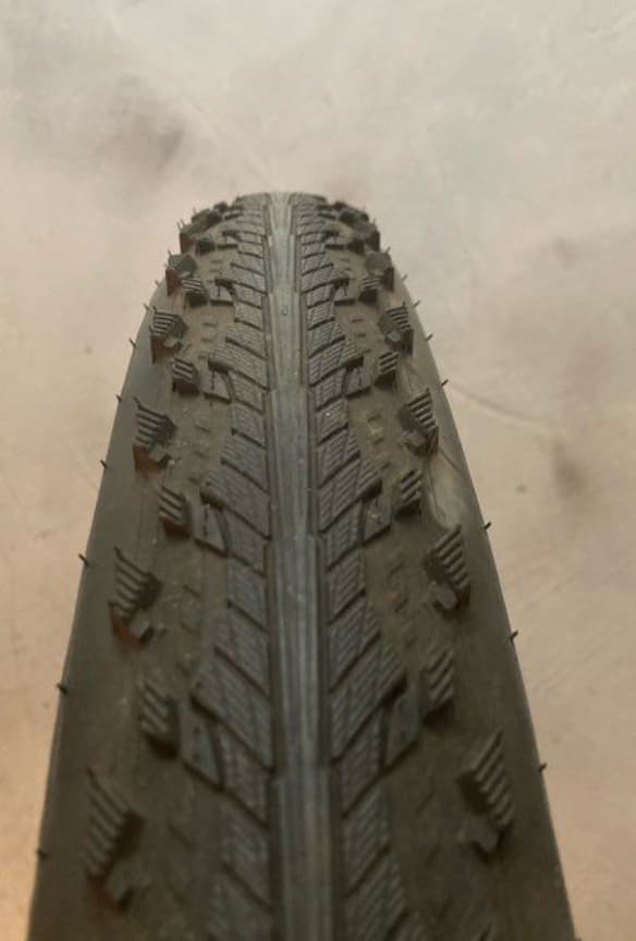 ça a l’avantage d’être très roulant et de garder de l’accroche en virage grâce aux crampons sur les côtés. Mais la section est trop fine pour moi, j’aime pas tellement, je me sens pas en équilibre en tournant