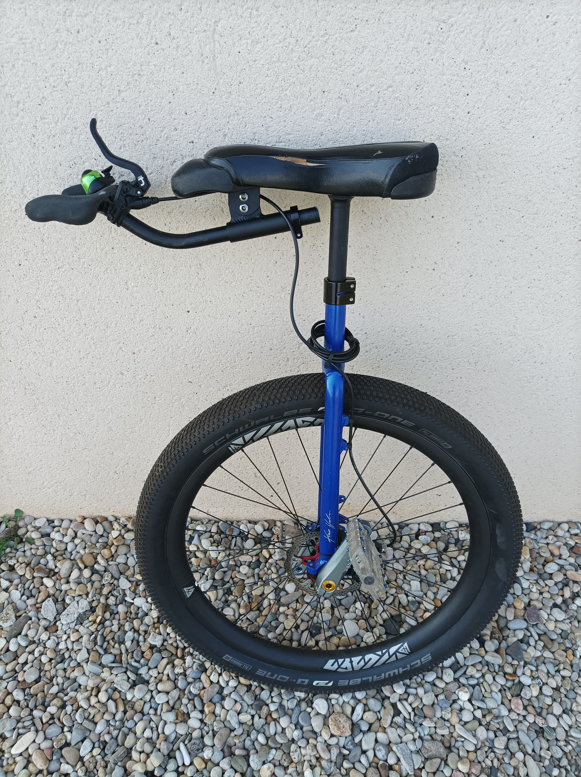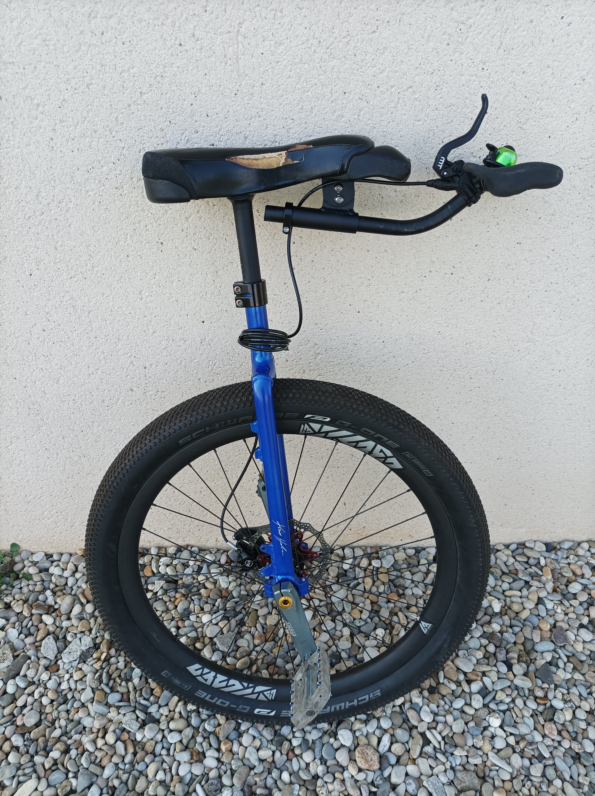Le monocycle a un frein Magura mt4, un guidon KH, et une selle fusion one fendue au niveau des Coutures.