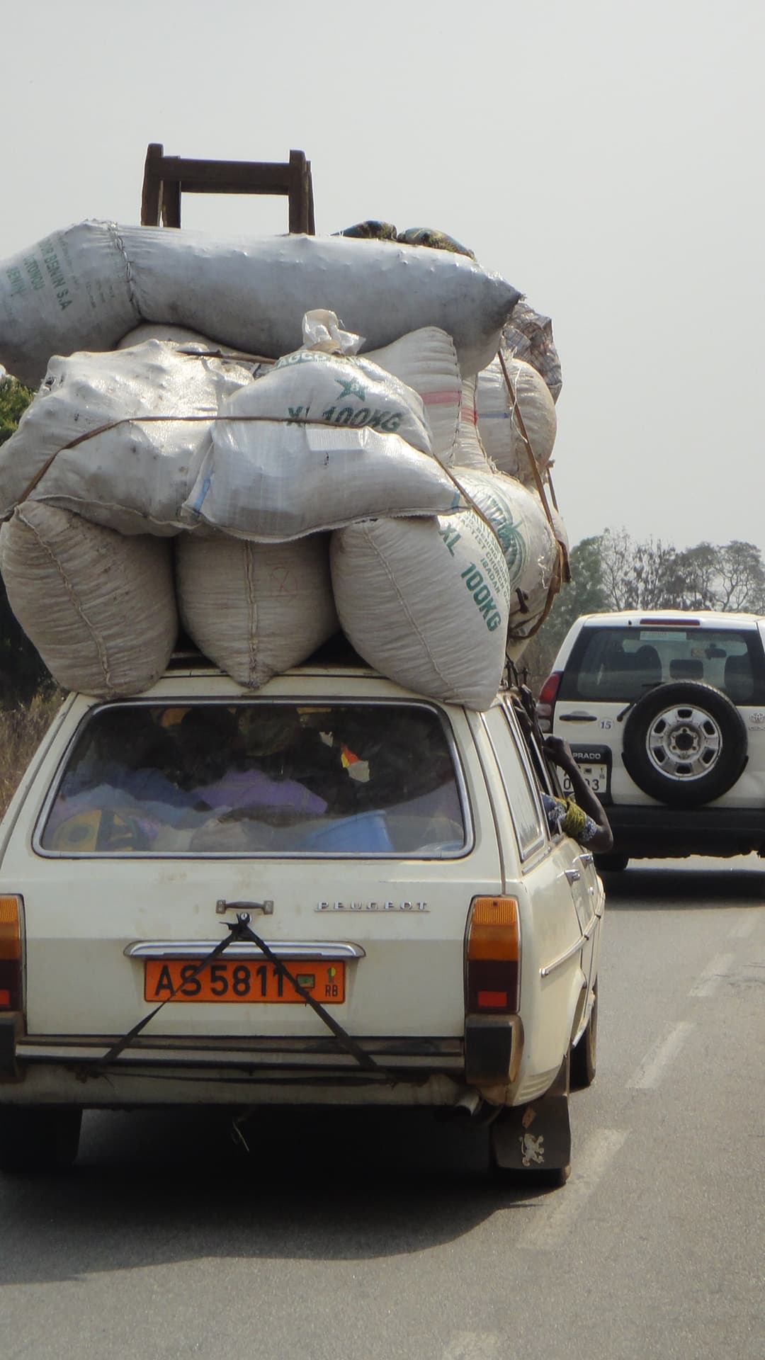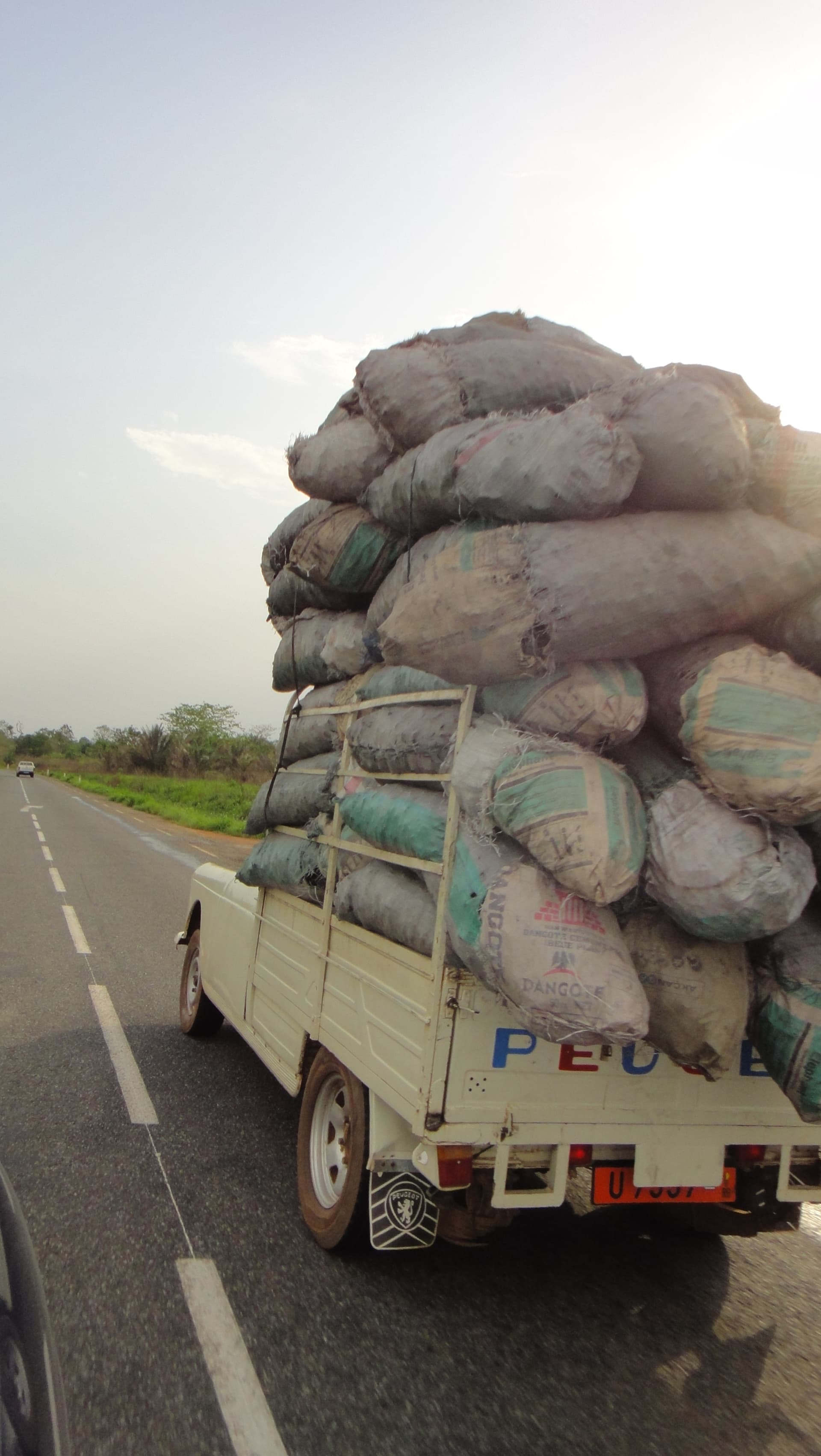 Sinon, je ne l’avais pas noté sur le coup, tout au dessus de la 504 c’est un sac de charbon type ! Et dans la série transport de charbon, je ne résiste pas à vous rajouter une photo d’un « baché » 404 béninois courant (beige) avec son chargement :