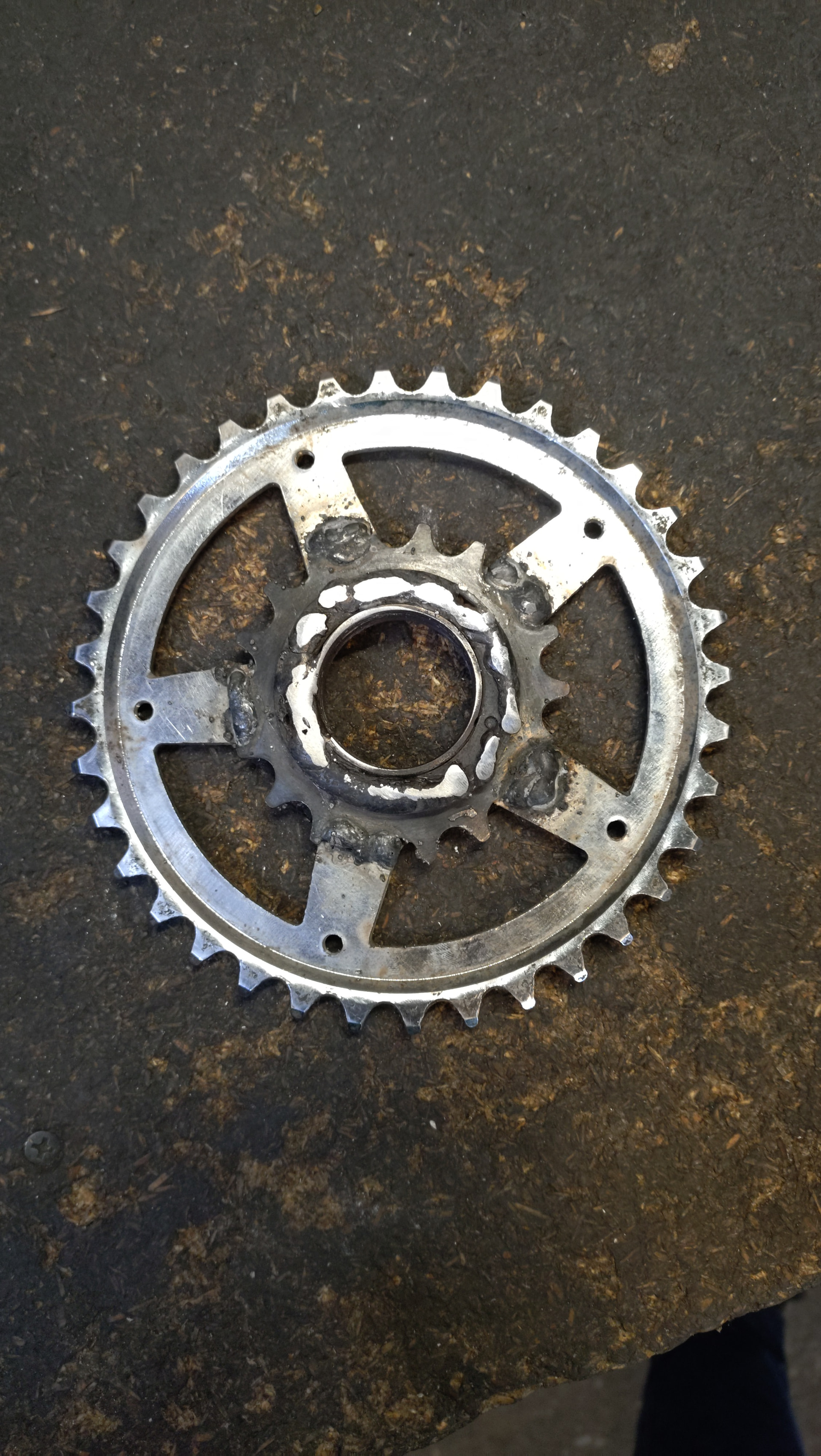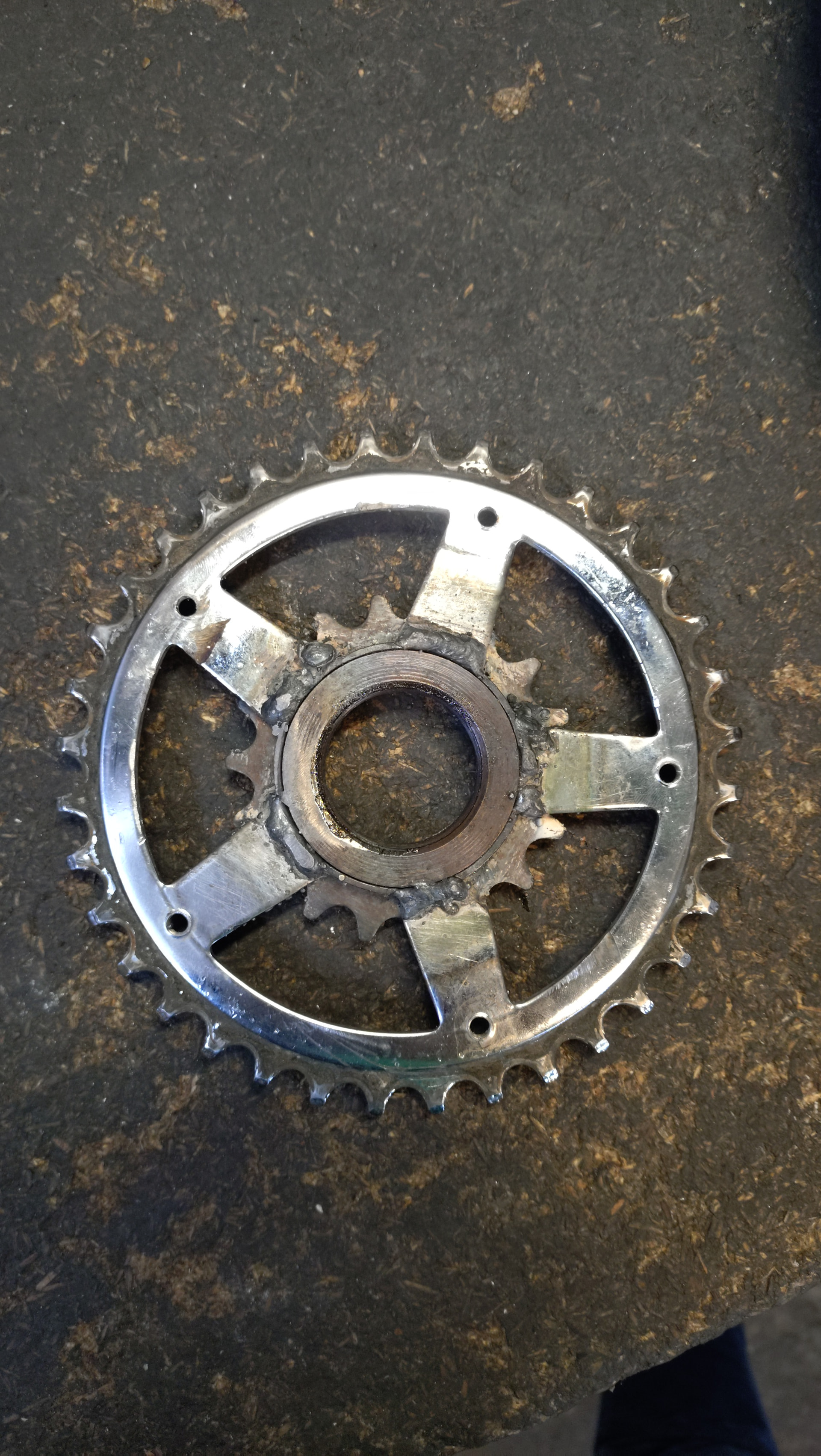 Update. Le mono n’est pas encore terminé, j’ai refait ma soudure et surtout ait rajouté un disque qui soit au bon nombre de dents (36), pour qu’il corresponde à celui du pédalier. Le plus dur ici, c’est de bien centrer en soudant.