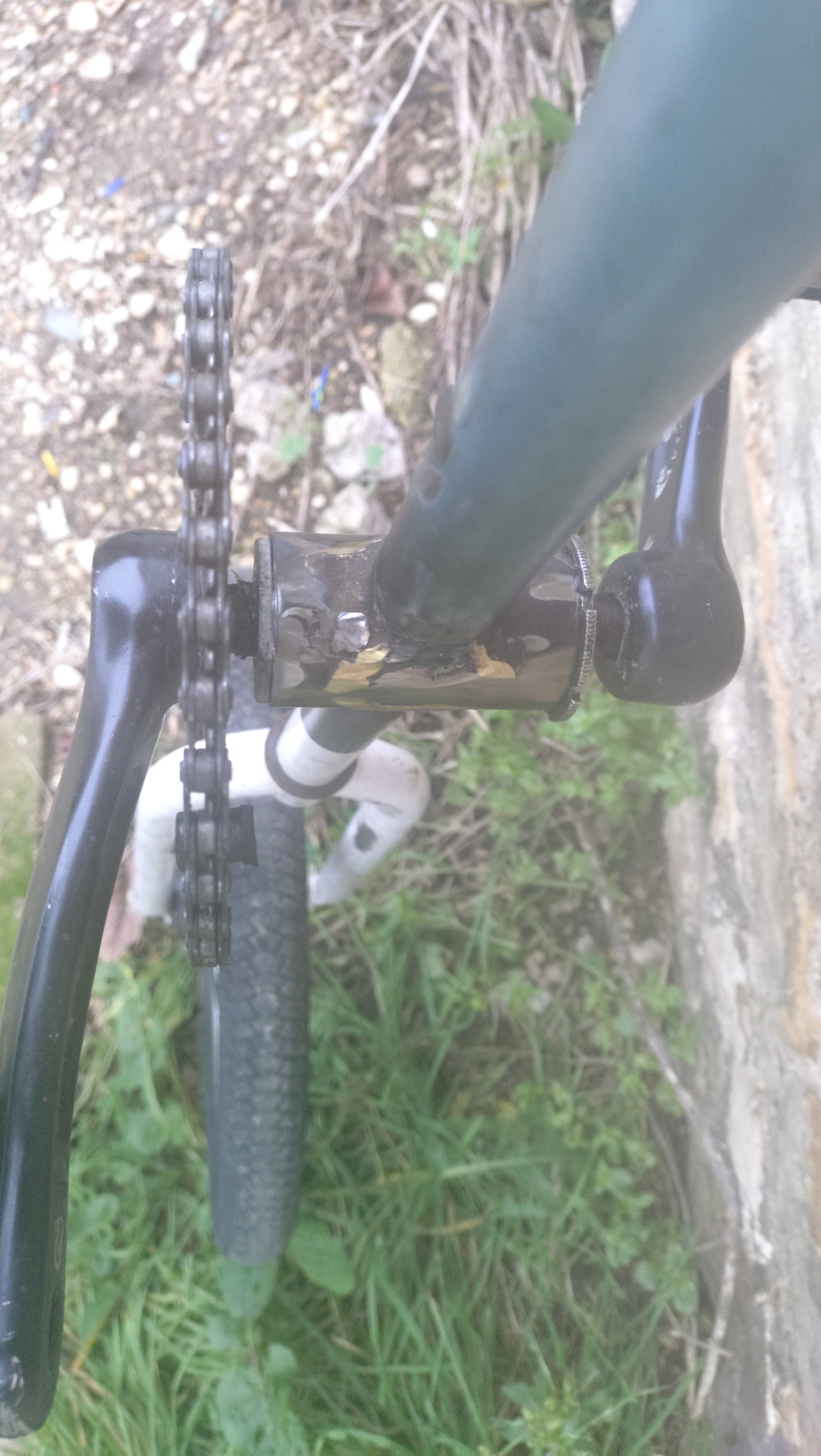Je pense que je vais garder cette allure. Je n’ai pas de chalumeau à disposition, et découper la fourche pour la ressouder bien dans l’alignement reste très compliqué. Ce n’est effectivement pas l’idéal, mais au moins ça roule.