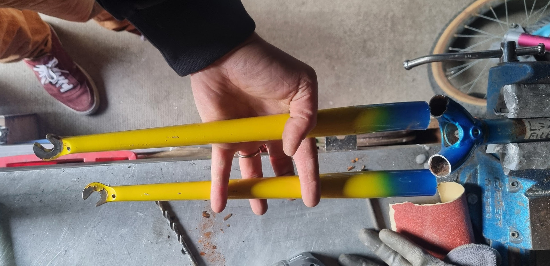 → avantage : tu as déjà des dropouts (la fixation du cadre à la roue) pour monocycle ! Par contre c’est pas forcément idéal de charcuter la fourche que tu as pour en rallonger les fourreaux.