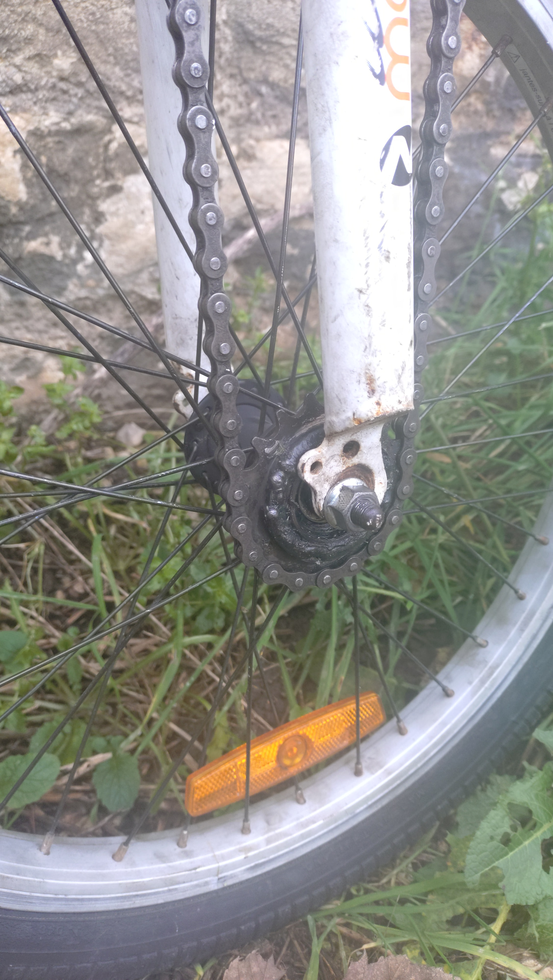 Une autre option qui m’est venue à l’esprit était sinon d’utiliser un moyeu arrière de fixie, ce qui impliquerait de réaliser une fourche de zéro (les fourches de vélo ne sont en effet pas plates). J’aurais aimé que @deloin soit encore actif sur le forum pour avoir quelques astuces de bricolage :’)