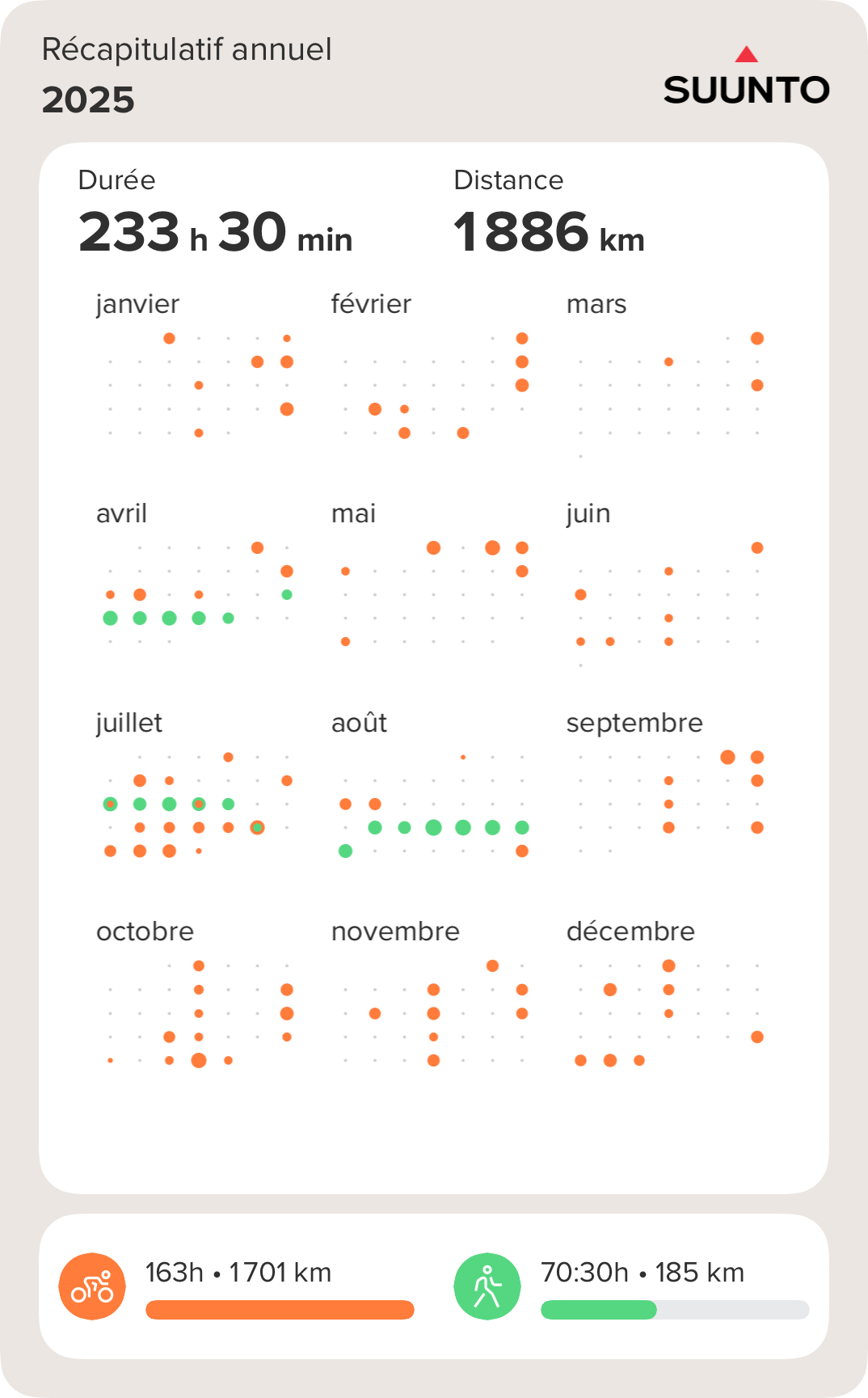 En tout cette annĂ©e, environ 1700 km parcourus en mono, en environ 160h. La casi-totalitĂ© effectuĂ©e en 29â, un peu en 36â, et un peu partout en France. Objectif pour lâannĂ©e prochaine: 2026 km, avec plus de 36â