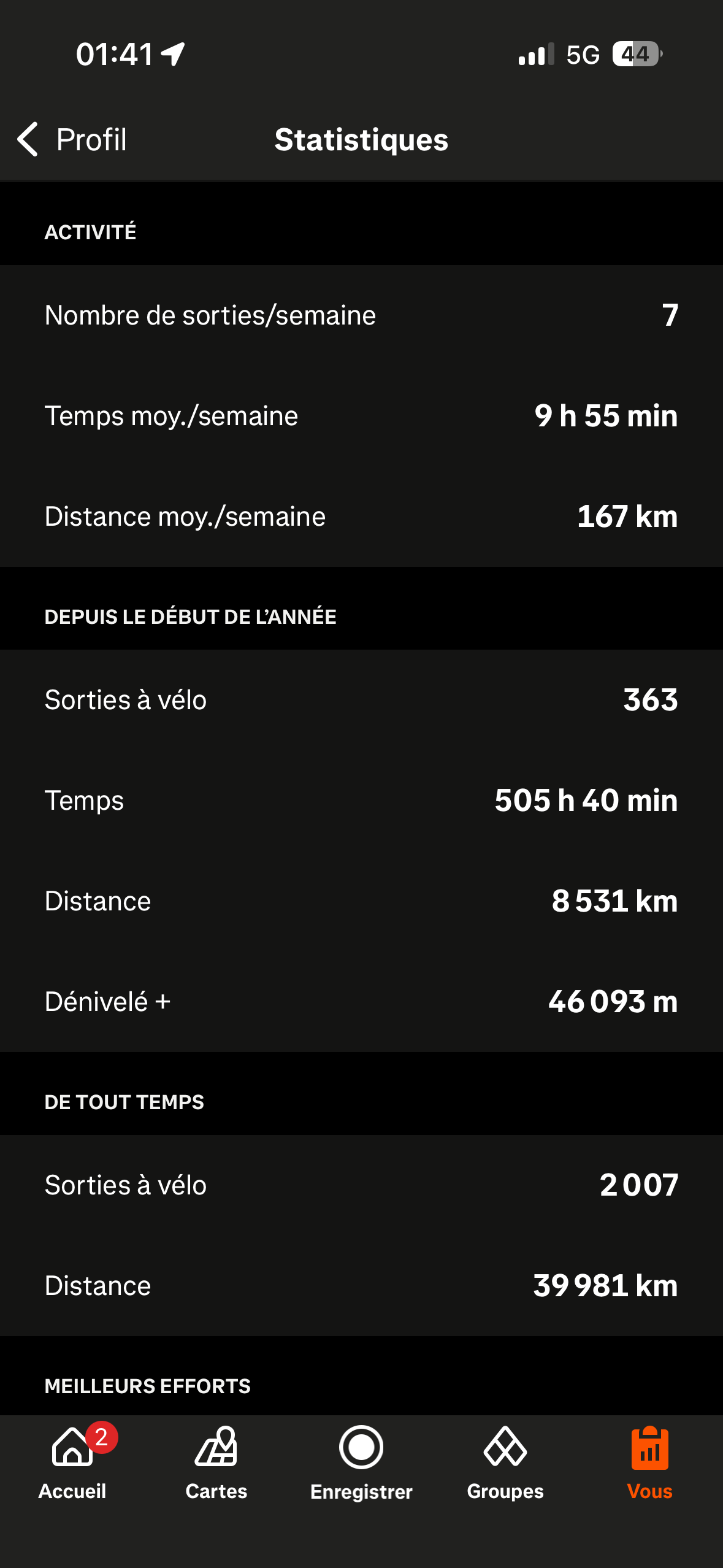 Voici mes stats pour 2025. En fait, le chiffre que je visais au dĂ©but de lâannĂ©e ! Jâaurais finalement fait 1515km. Je suis tout de mĂȘme content car jâai doublĂ© la distance par rapport Ă 2024 (890km).