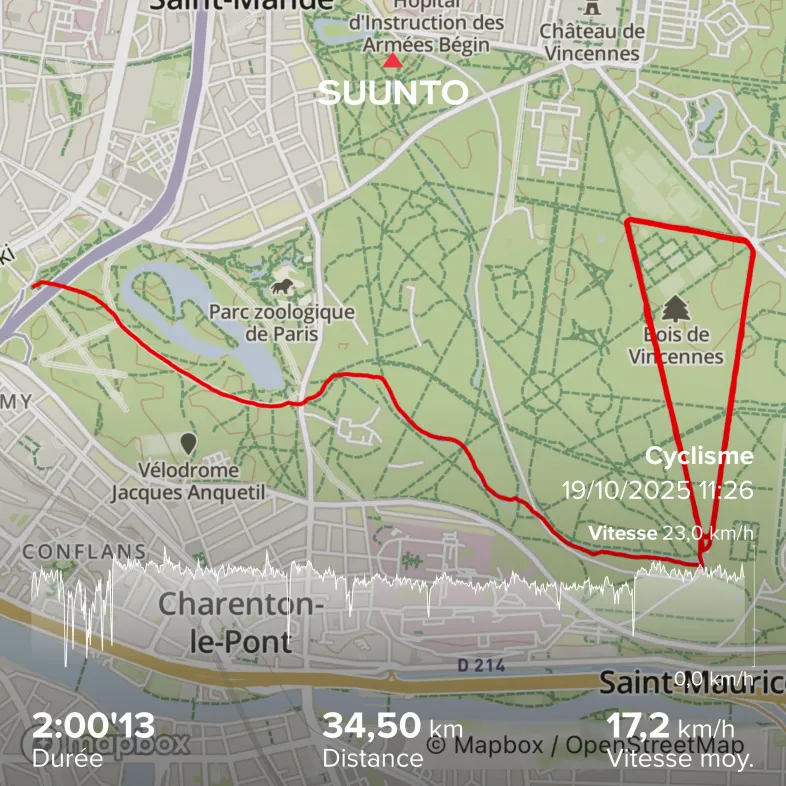 Hier j’ai fait ma plus grande sortie jusqu’à présent: 49 km, encore plus long que la balade du canal de l’Ourcq. 5 km pour aller jusqu’au bois de Vincennes, puis ensuite j’ai pédalé pendant deux heures en faisant des tours de piste pour ma participation au Desafío ruta. En tout 34,5 km pour cette partie là, avec à l’intérieur un entrainement pour le 10km, que j’ai réussi à faire en 31-32 minutes. Et ensuite il a fallu rentrer