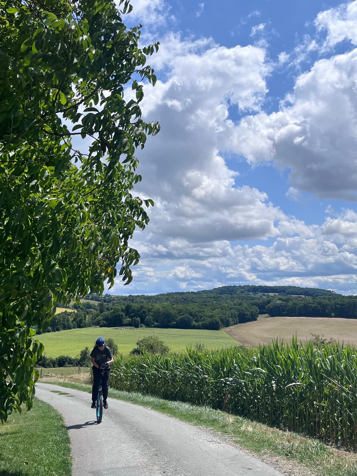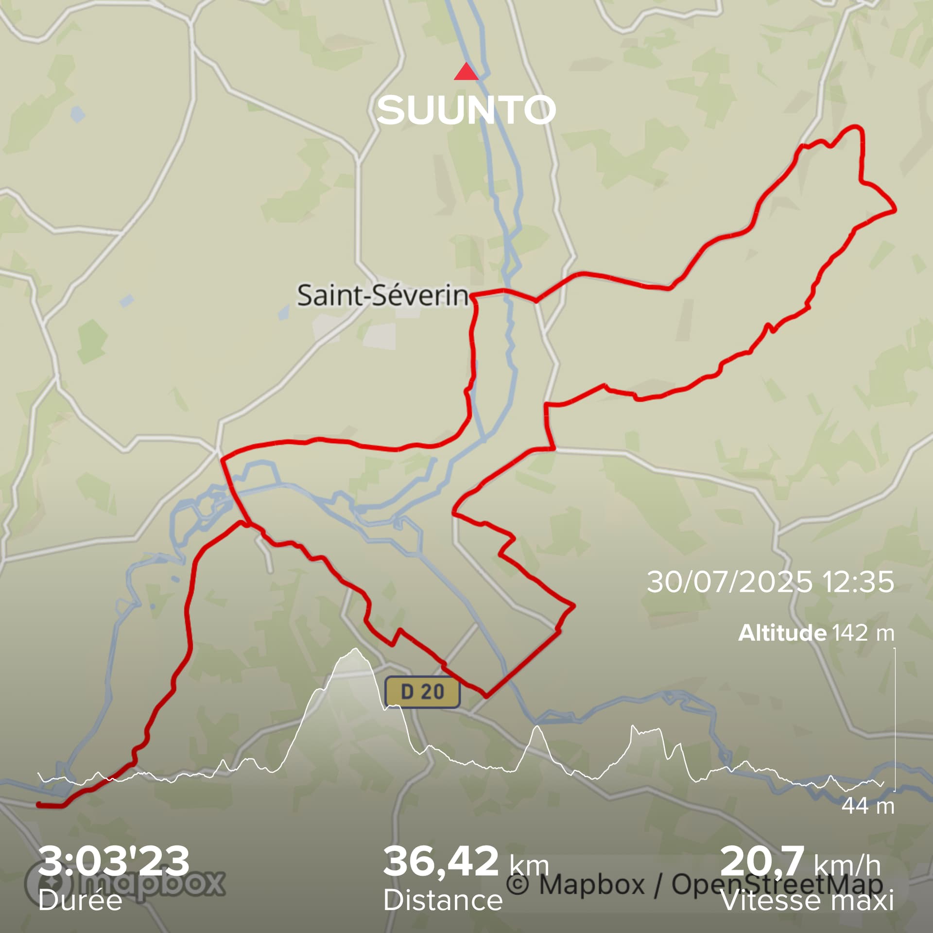 Hier, ma plus grosse balade à mono depuis le début de l’année. 36km entre la Charente et la Dordogne, avec une belle montée de 90m sur un peu plus de 3km pour arriver à Lusignac.
