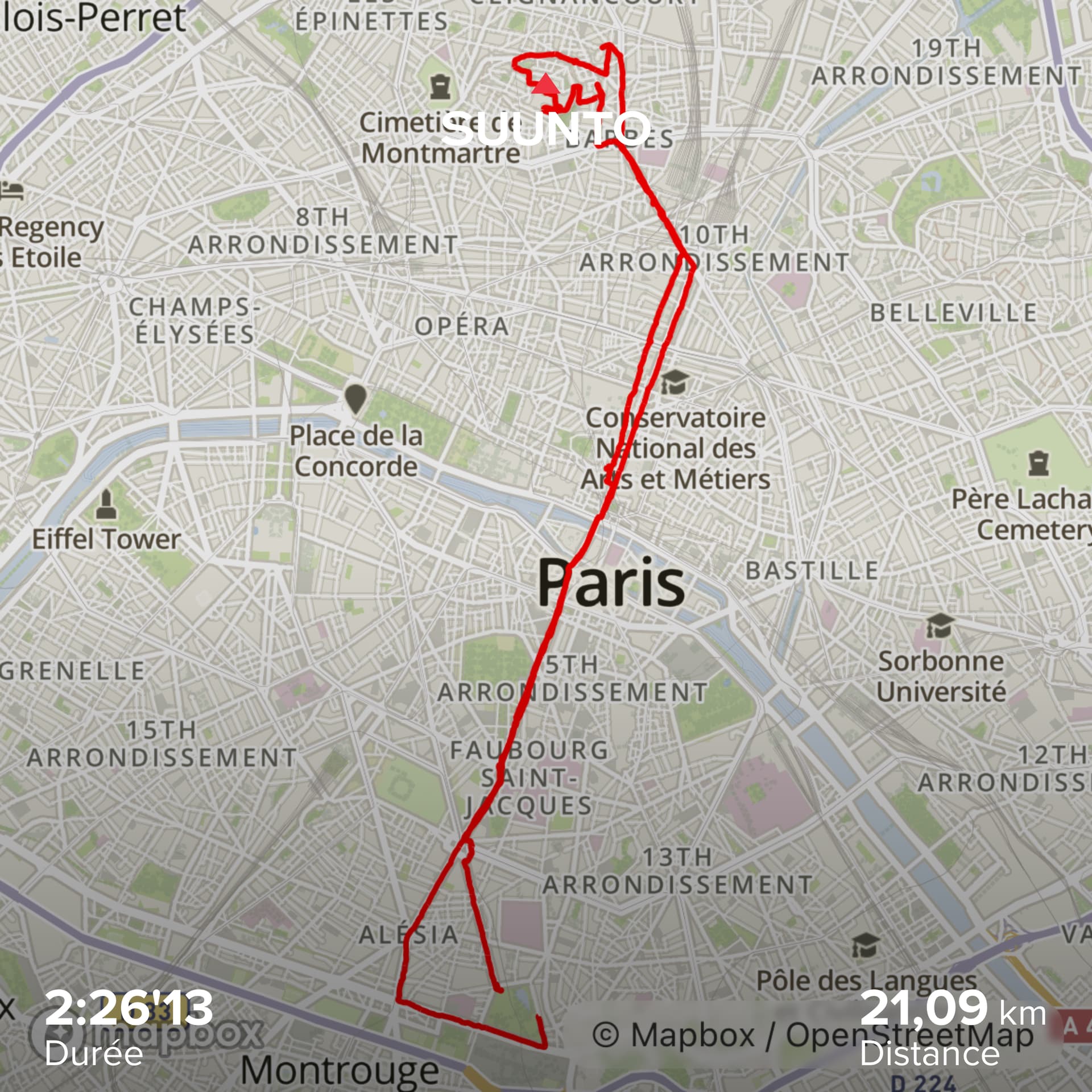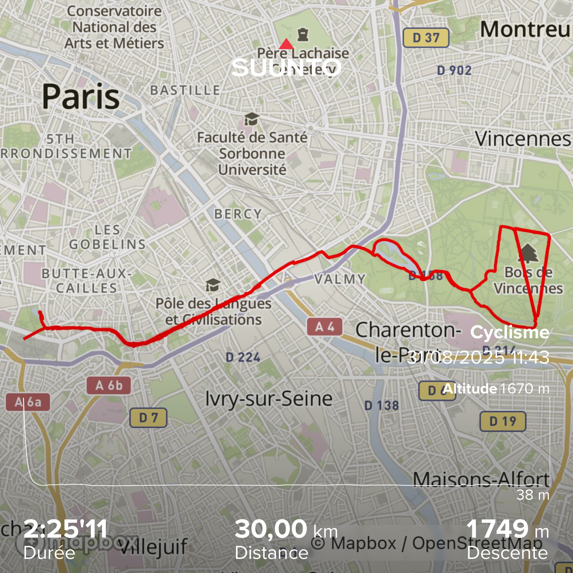 Bois de Vincennes, comme d’habitude, et avec trois tours de piste cyclable, donc 9,5 km sans m’arrêter.