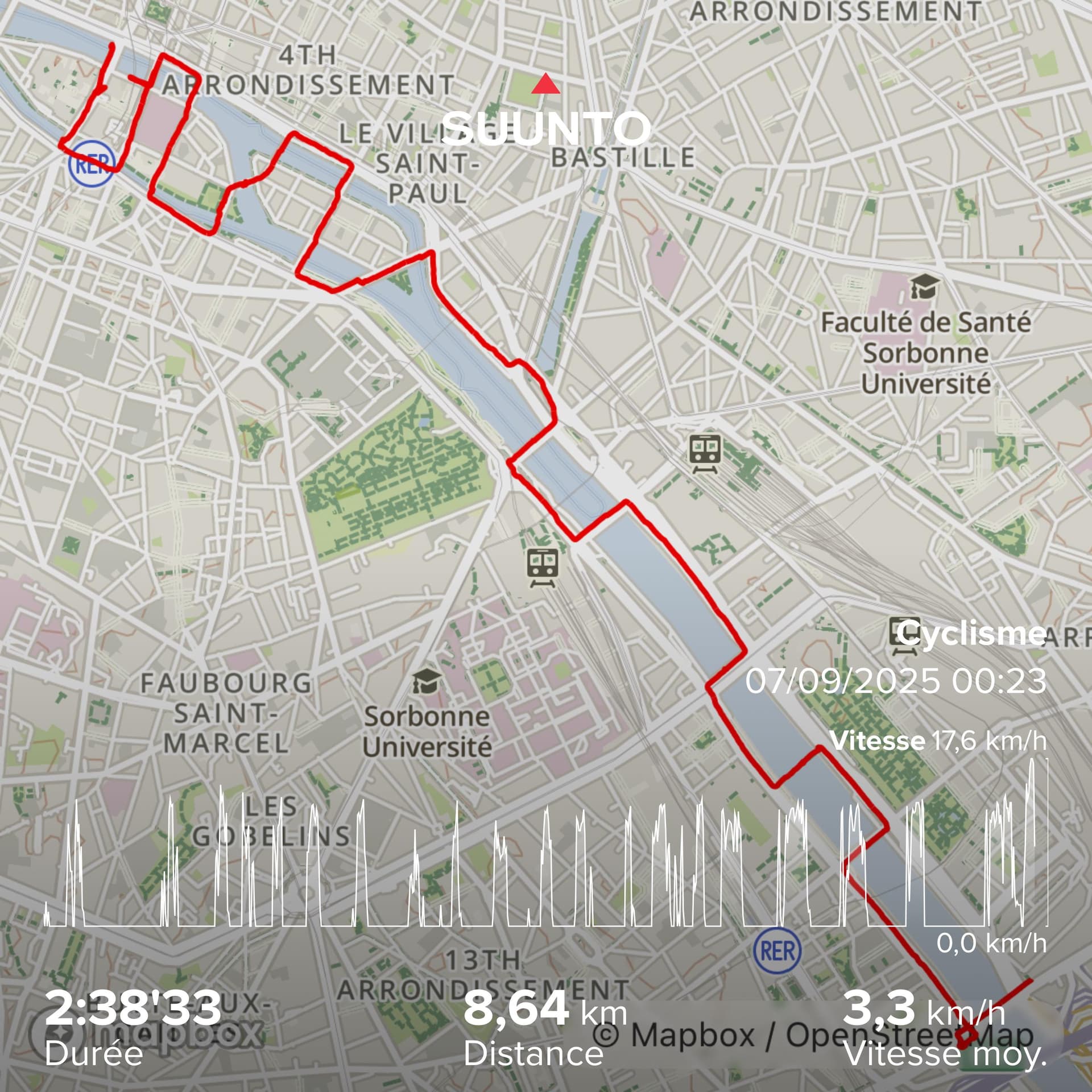 Partis à 18 environ du Pont du Garigliano à 20h, arrivés à huit au Pont National à trois heures du matin.