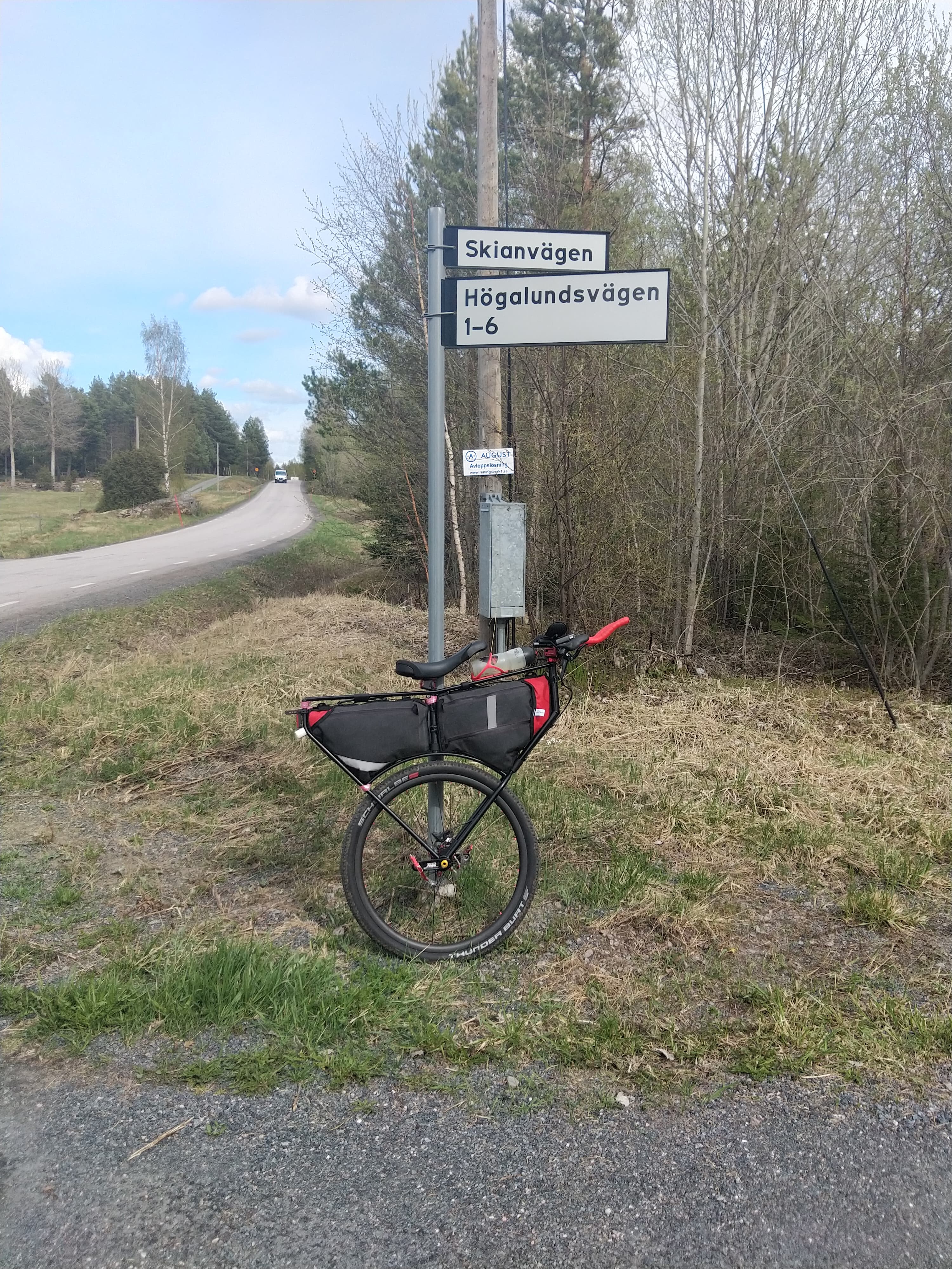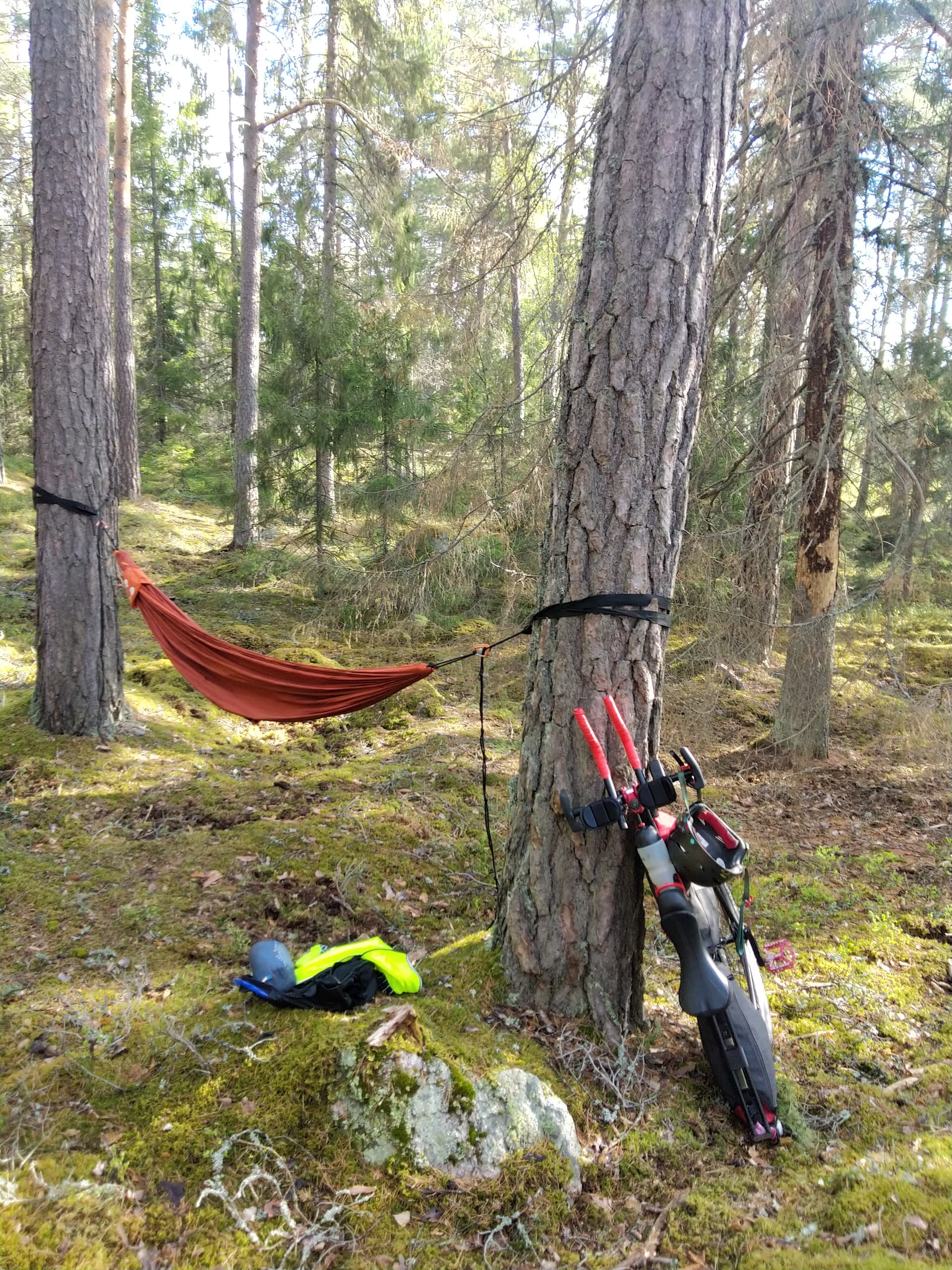 Et puis vers les 140 km, j’ai recommencé à mouliner, je montais à 22 sur le plat, par contre la moindre côte me coupait dans mon élan, j’avais plus de force dans les jambes. Je voyais de plus en plus souvent des panneaux Stockholm, et je me demandais de plus en plus si je chercherai pas à pousser jusqu’au bout (alors que 20 km plus tôt c’était hors de question). Et vers 3h, le soleil se levait, j’ai atteint les 160, dans une zone non éclairée, avec une forêt. Pas la moindre hésitation: installation du hamac et au dodo.