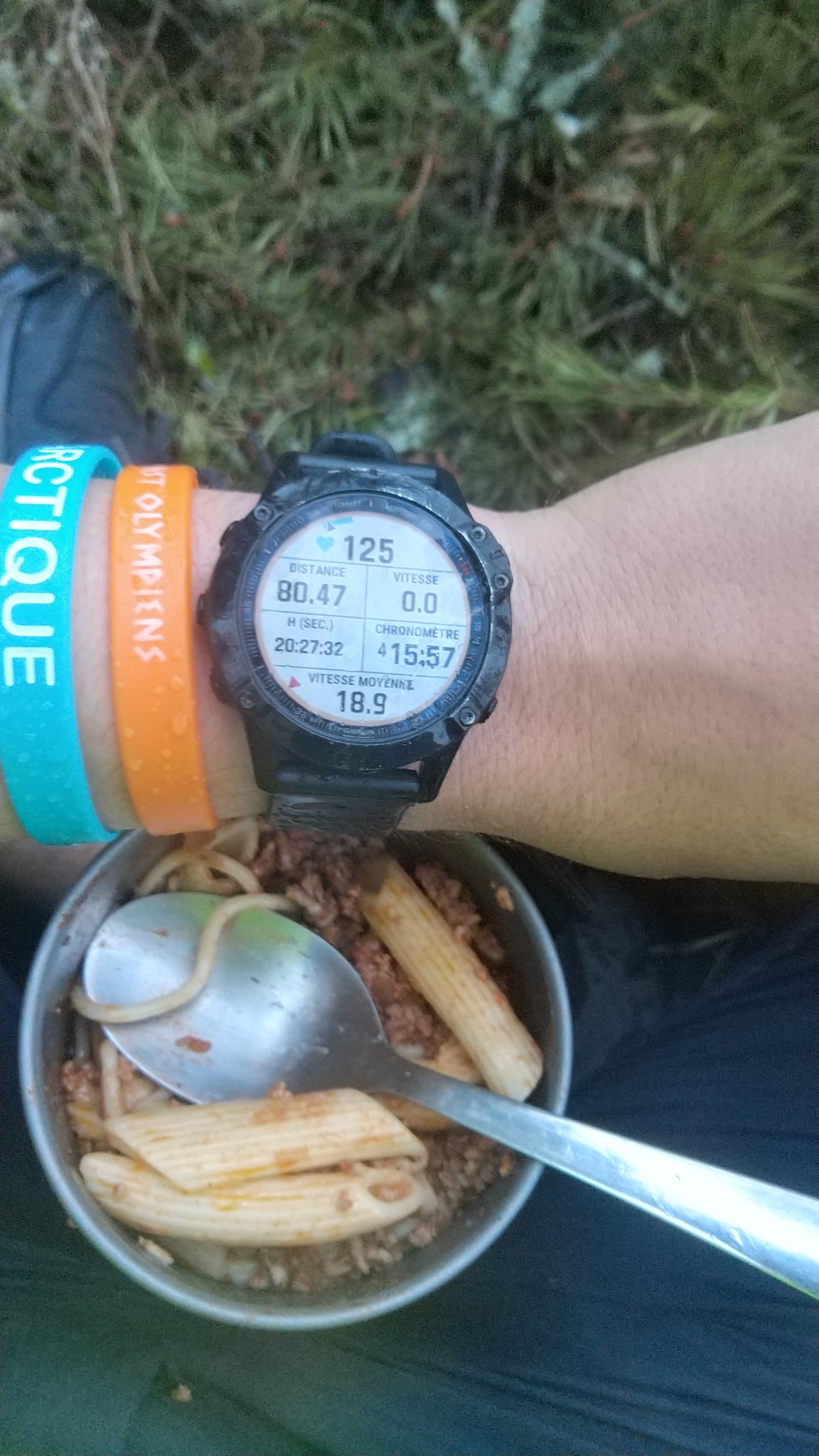 Et, au km 70, la pluie est arrivée. Je me suis vite refroidi mais ça allait. Jusqu’au moment où j’ai décidé de m’arrêter manger (km 80). C’était des pâtes carbo froides, donc très bon, facile à manger, mais pas rechauffant. J’en ai mangé le tiers et je suis reparti car je sentais que je me refroidissais.