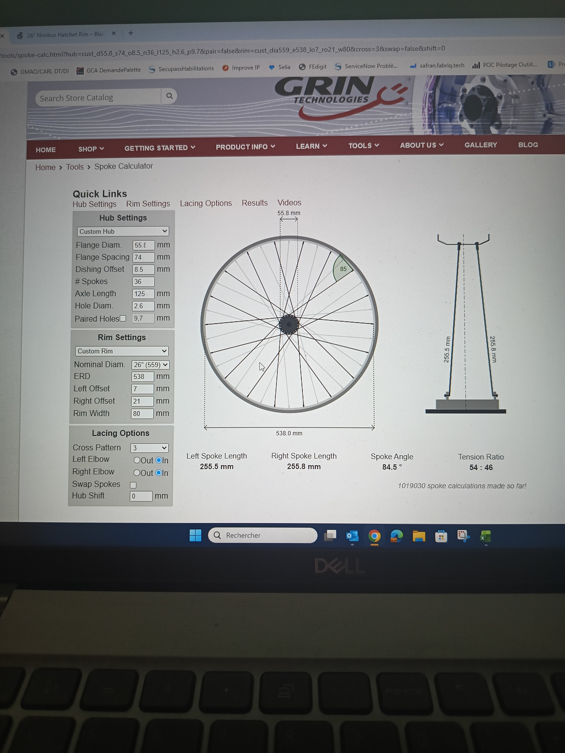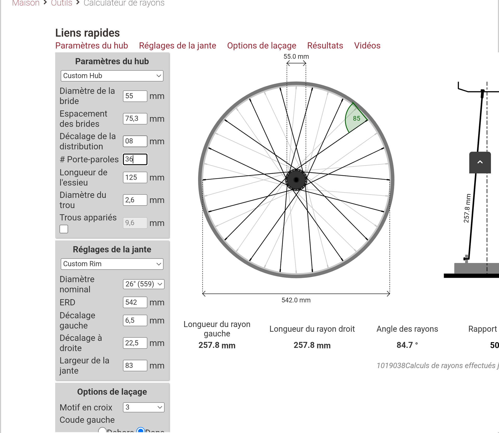 Du coup j’ai avancé et j’ai renseigné le spoke canadien. Je trouve 255,5 et 255,8mm. Alors que j’avais 256 et 259 avec l’autre calculateur.
