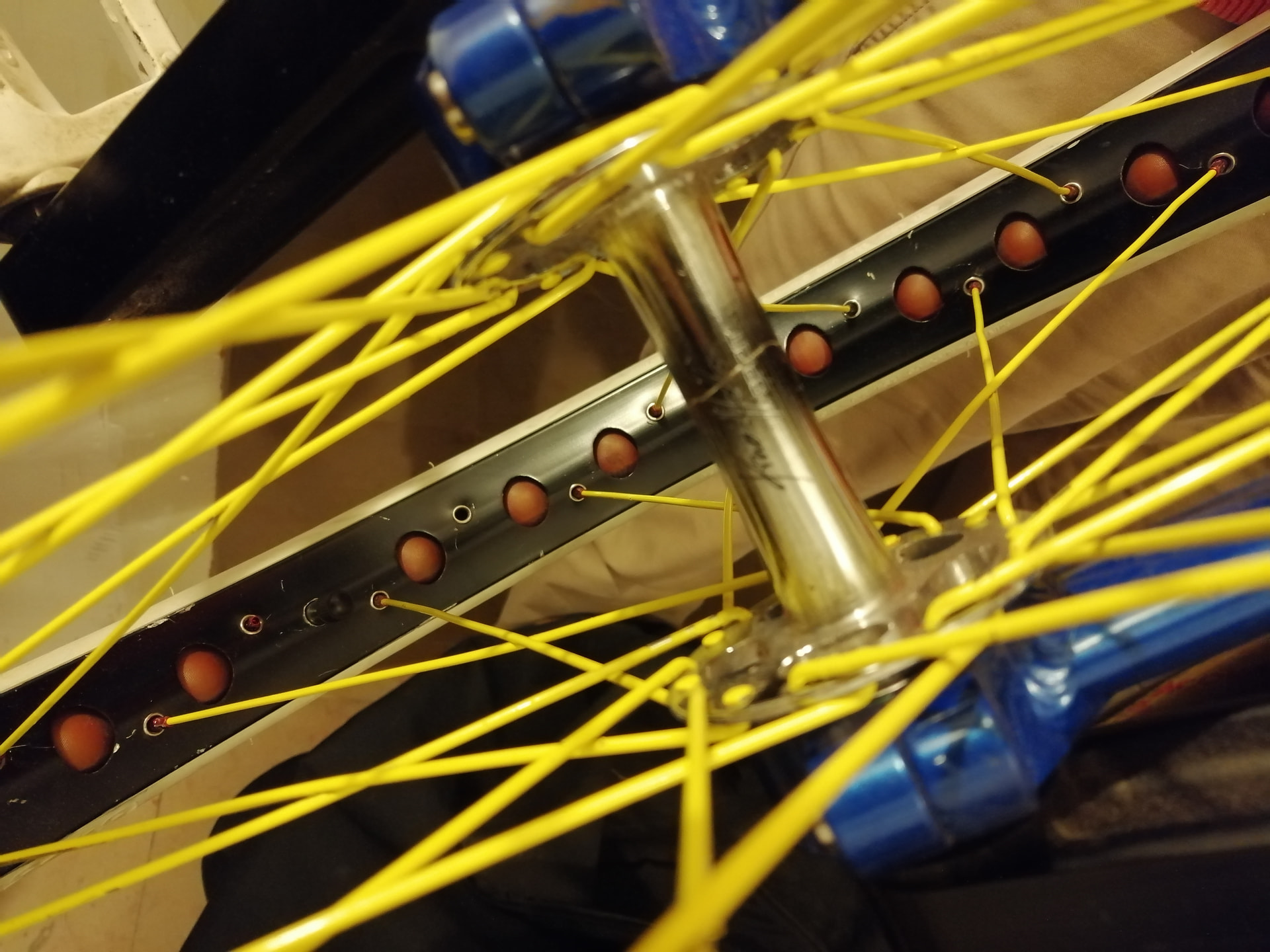 En regardant à nouveau la photo j’ai remarqué que la jante semble déformée au niveau de la tête de rayon. Comme ci les rayons avaient tiré très fort sur la jante