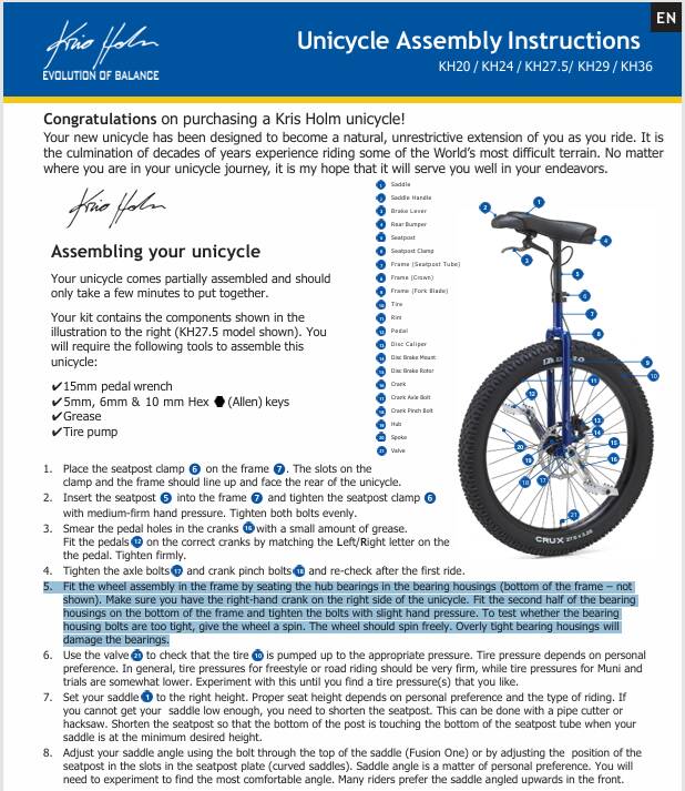Il ne faut surtout pas serrer fort, on le redit, c’est un maintien en position, sans le moindre jeu, mais il ne doit pas non plus y avoir de contrainte de compression sur la cage extérieur du roulement (pour s’en assurer, on retourne le monocycle, et on s’assure que " la roue tourne librement").