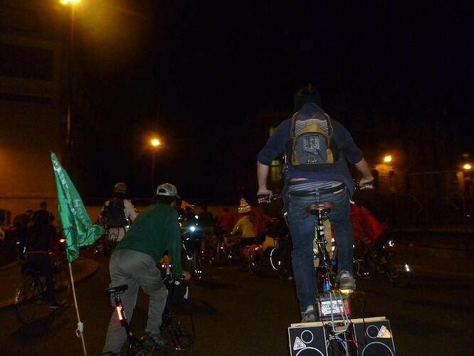 toujours quelques vélos à étages dont celui là bien sympa que l’on commence à connaitre et croisé récemment par hasard un mardi soir, avec sa batterie pour alimenter ses enceintes, il crache du rock et du métal à 100m à la ronde ! Y avait aussi un vélo couché qui sait faire du mono, non ce n’était pas Zip …