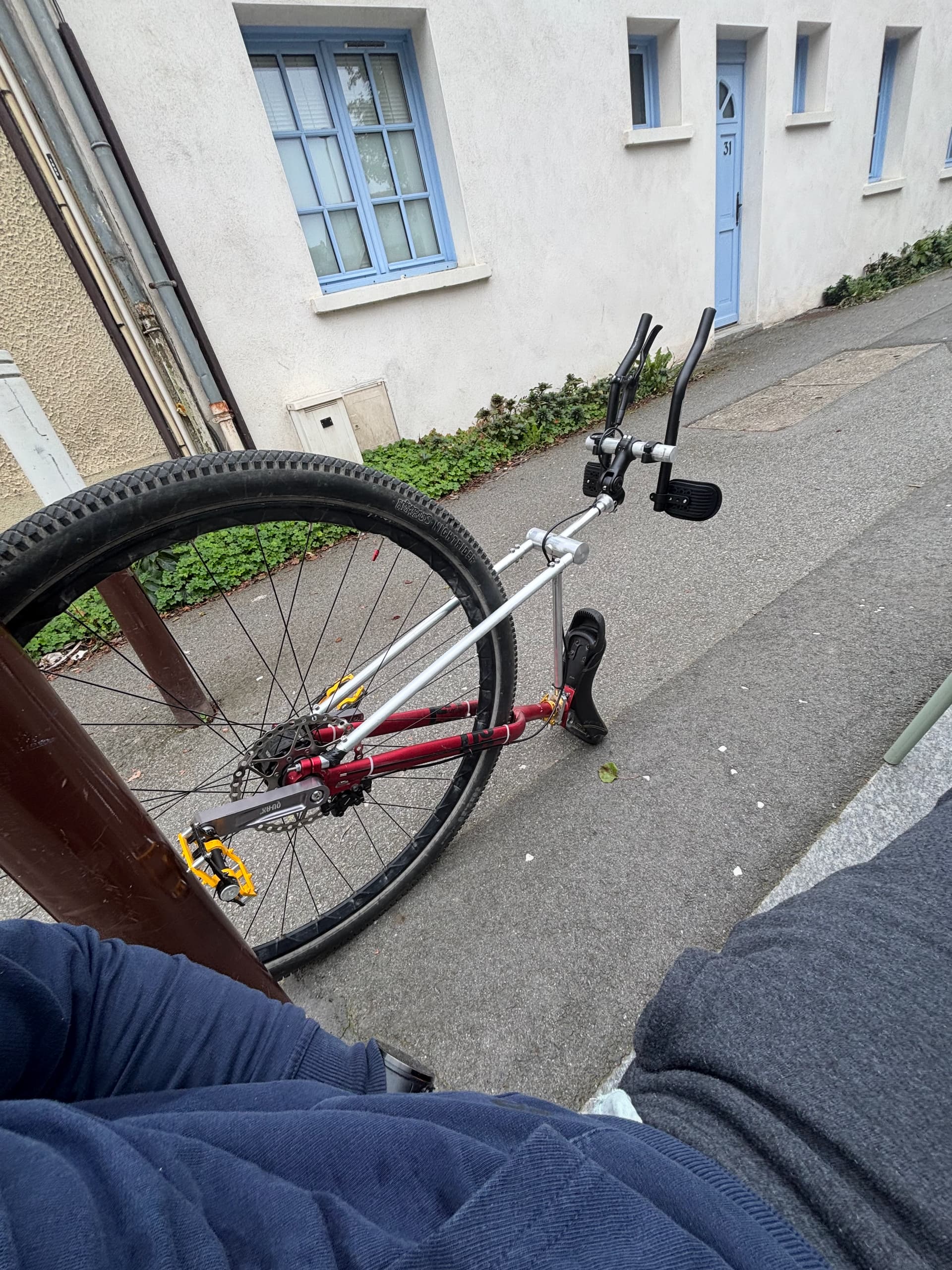 Concernant les douleurs, peut-être que ton montage n’est pas à ta taille. Il faut peut-être rapprocher un peu les barres (elles me semblent très éloignées l’une de l’autre, encore plus que les miennes), et peut-être les tourner pour qu’elles pointent autrement. Ça vaudrait peut-être le coup que tu en discutes en vrai avec @toutestbon, il aura sans doute de bons conseils en voyant directement la bête.